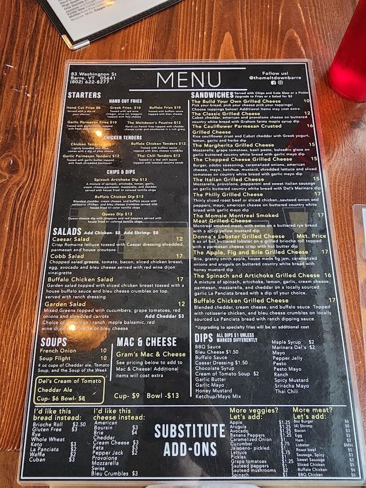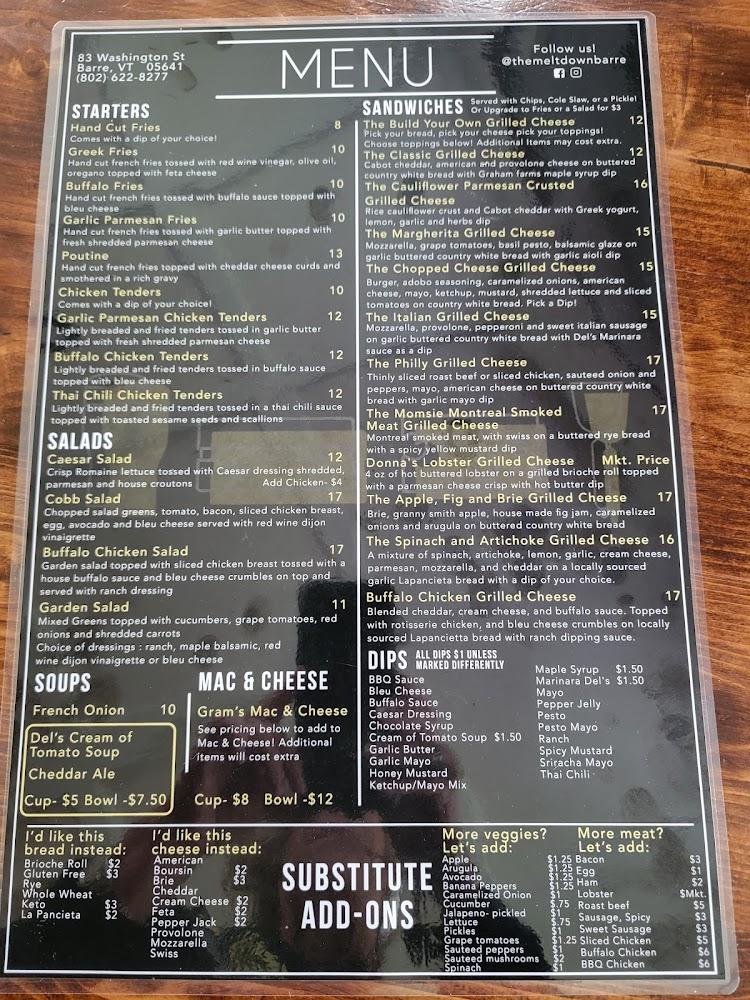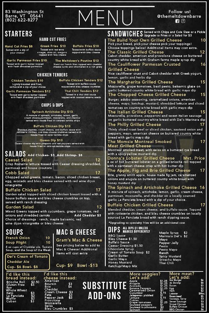 Welcome to The Meltdown Grilled Cheese and Tap Room, where comfort food meets craft brews! Located in the heart of Barre, VT, our cozy establishment specializes in gourmet grilled cheese sandwiches, offering a variety of options to satisfy every palate. Complement your meal with our extensive selection of beers on tap, specialty wines, and mouthwatering desserts. Enjoy a relaxed atmosphere perfect for lunch, dinner, or solo dining. With accessible seating and quick service, we cater to everyone. Join us at 83 Washington St for a delightful experience that celebrates local flavors and a love for grilled cheese!